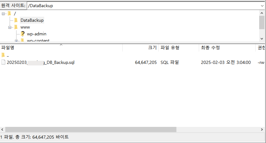 1일 전 DB의 백업을 신청하면 잠시 후에 FTP를 통해 다운로드할 수 있습니다. 살펴보니 백업된 DB 파일도 /DataBackup 폴더에 생성되네요.