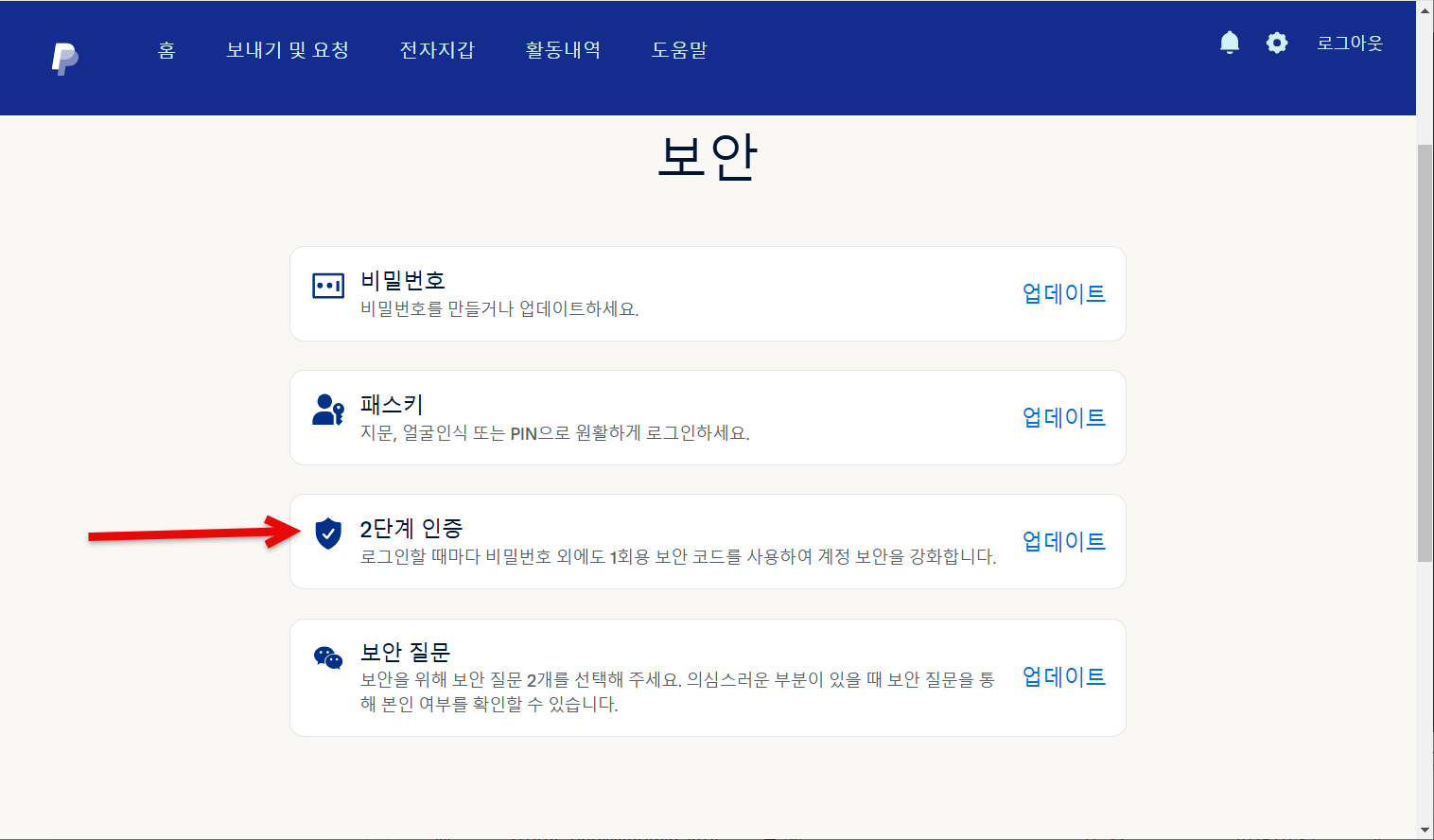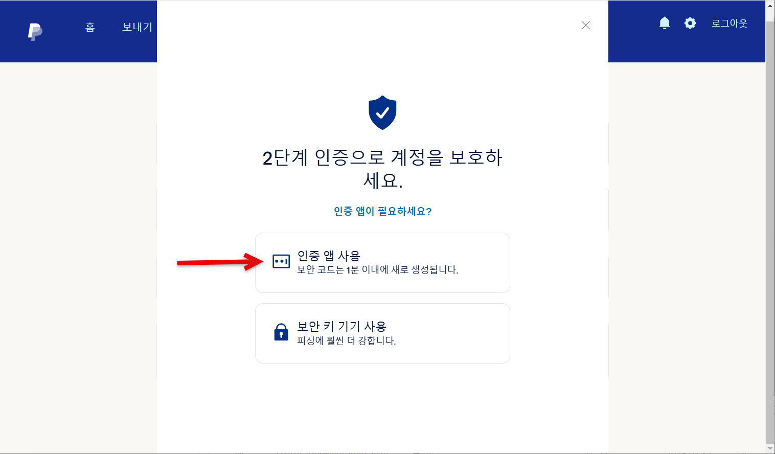 3. 보안 페이지가 표시되면 2단계 인증을 선택합니다.