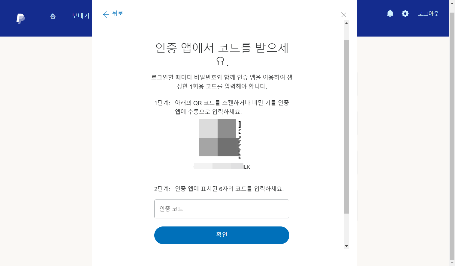 5. 아래와 같은 화면이 표시되면 인증 앱에서 화면의 QR 코드를 스캔하여 페이팔을 추가할 수 있습니다.