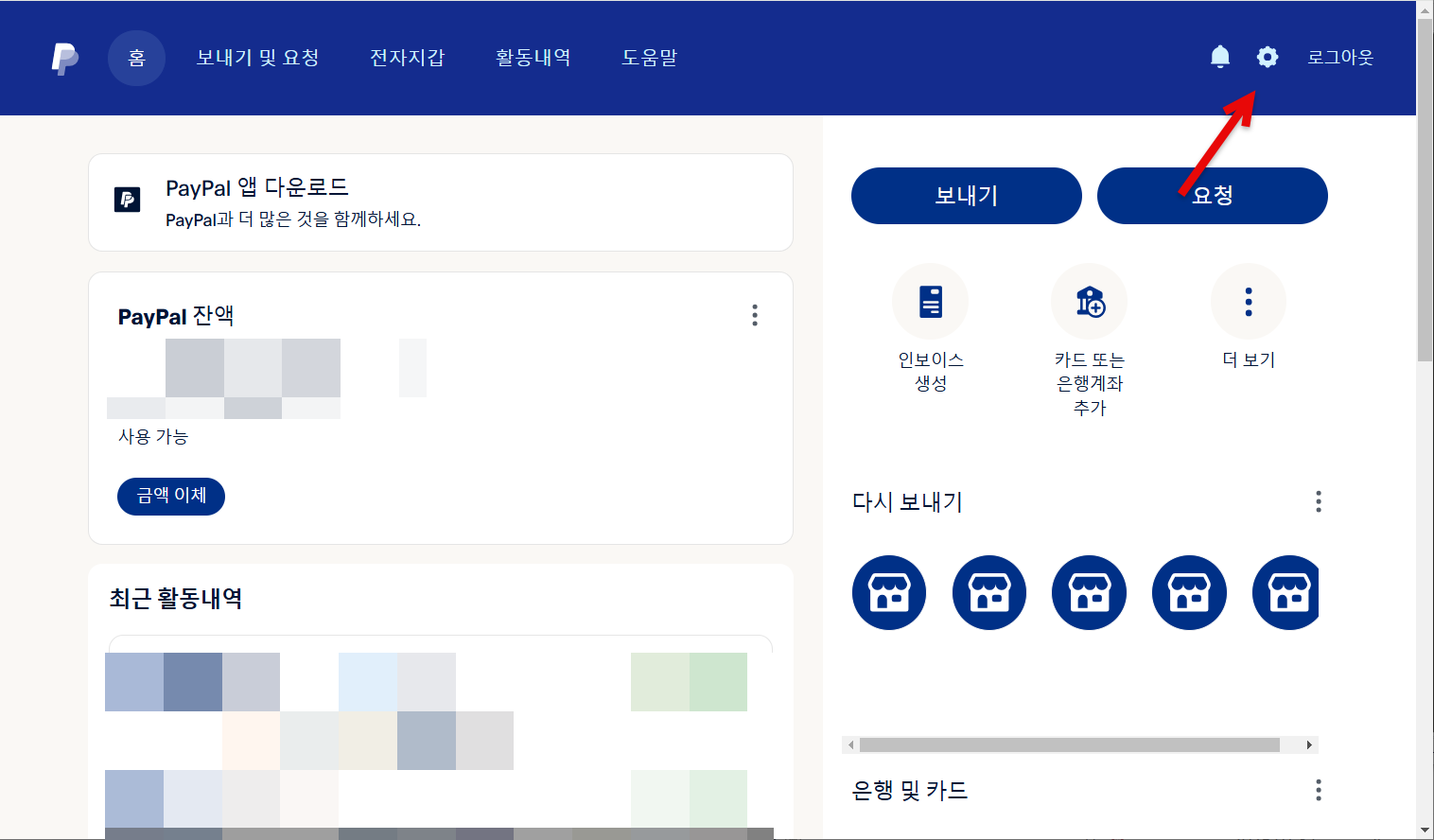 1. 페이팔에 로그인한 다음, 로그아웃 옆의 설정 아이콘(톱니바퀴 모양의 아이콘)을 클릭합니다.