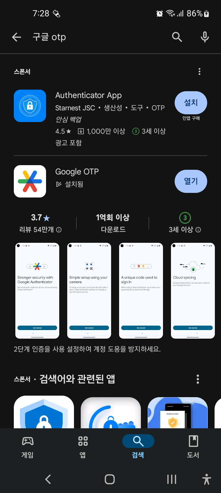 안드로이드 폰을 사용하는 경우 플레이 스토어에서 구글 otp를 검색하여 Google OTP 앱을 설치하시기 바랍니다.