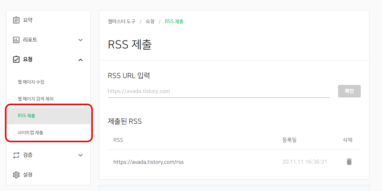 네이버의 경우 네이버 서치 어드바이저의 네이버 웹마스터 도구에서 RSS와 사이트맵을 제출할 수 있습니다.