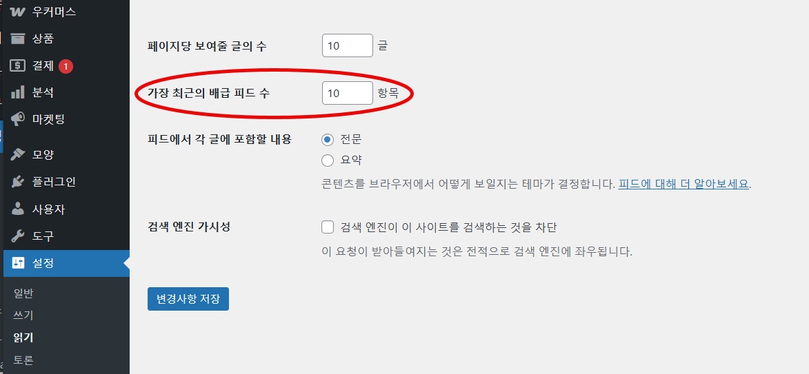 워드프레스의 경우 기본적으로 RSS 피드 항목 개수는 10개로 설정되어 있습니다.