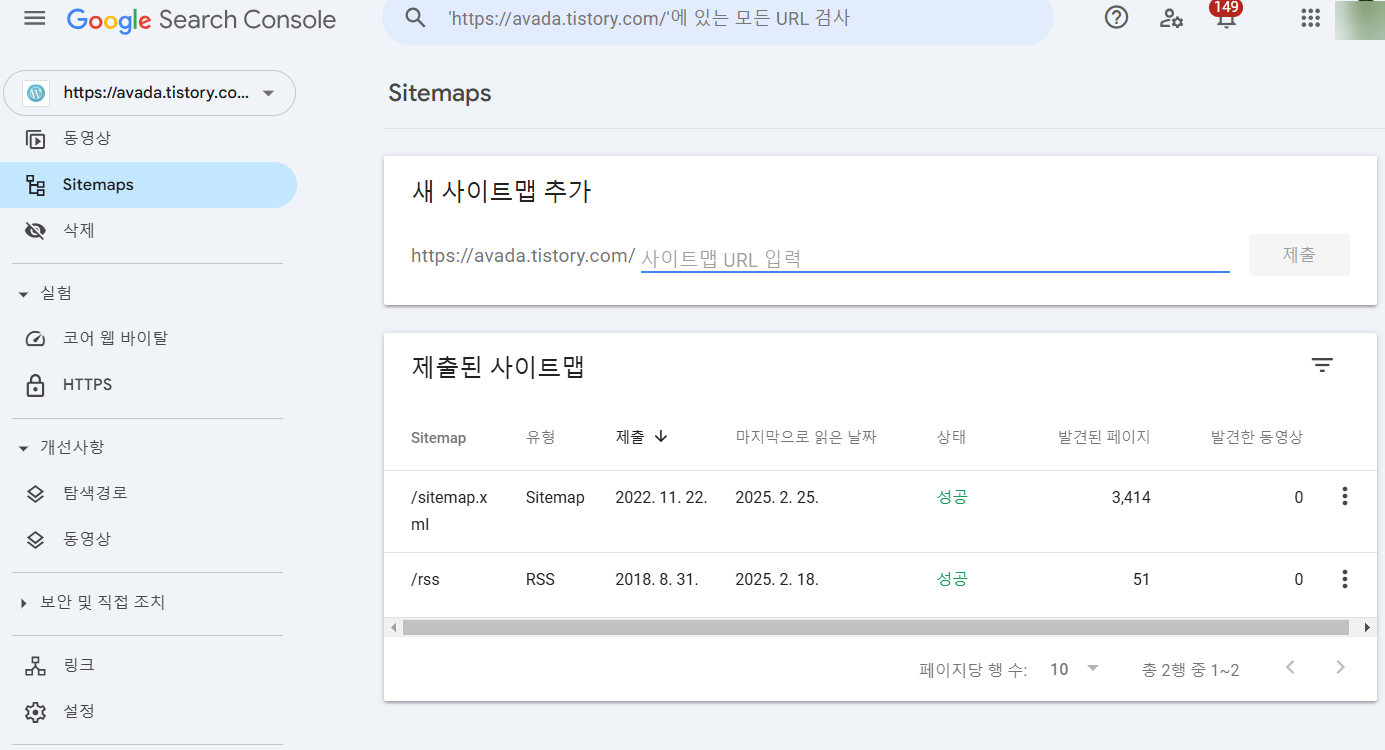 구글 검색 콘솔의 경우 Sitemaps 메뉴에서 사이트맵과 RSS를 제출하도록 합니다.