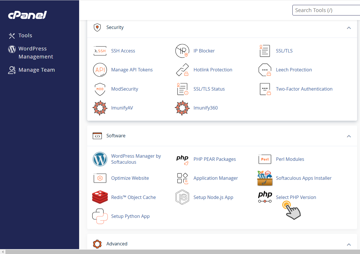 씨패널에 접속하면 Software » Select PHP Version을 클릭합니다.
