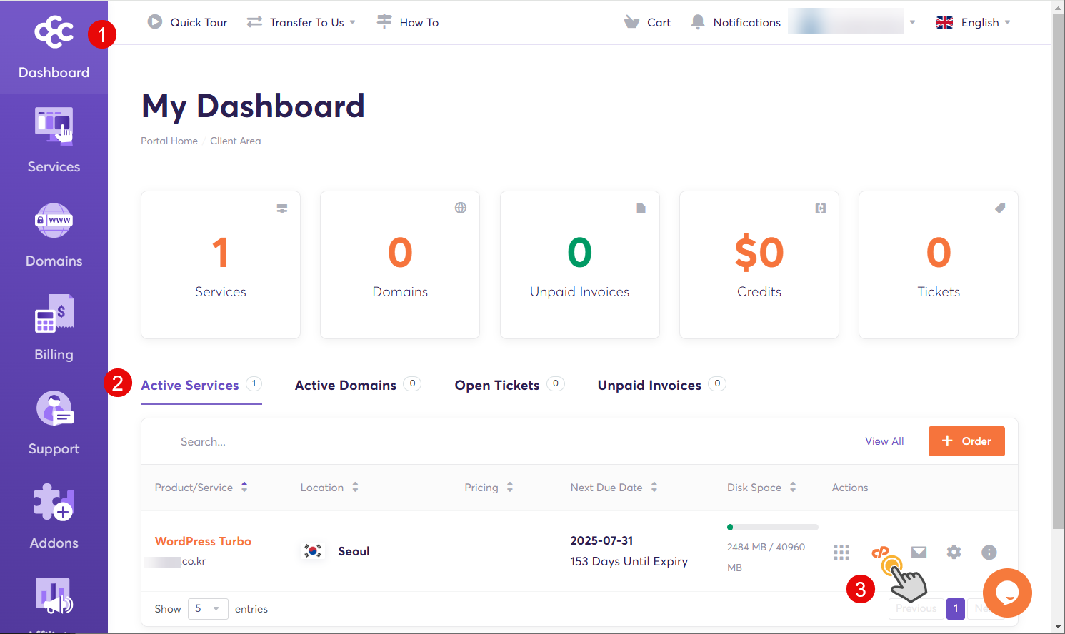 케미클라우드를 이용하는 경우 케미클라우드에 로그인한 다음, Dashboard » Active Services 탭에서 해당 호스팅 상품(예: 워드프레스 호스팅)의 오른쪽에 있는 cPanel 아이콘을 클릭하여 cPanel에 접속할 수 있습니다.