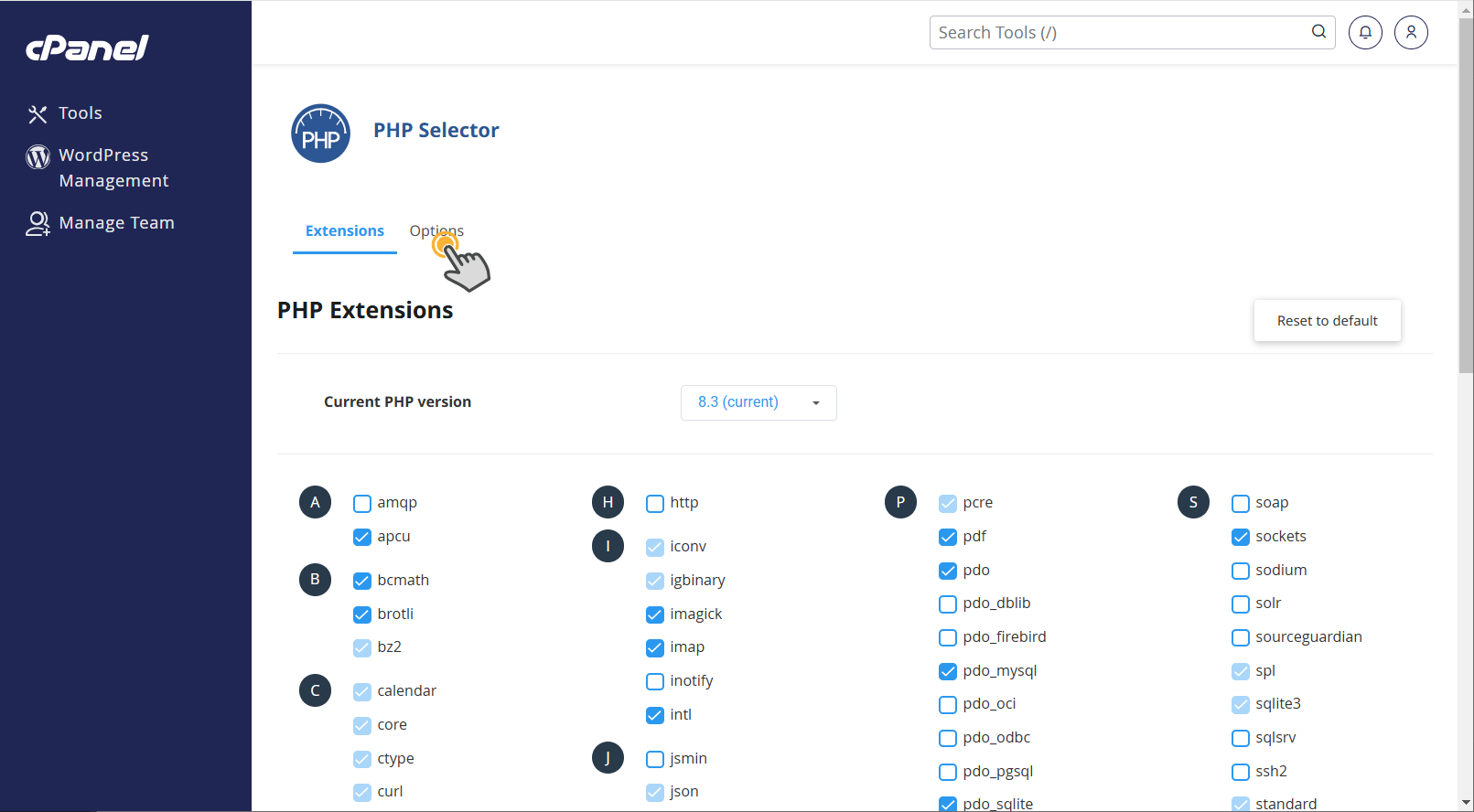PHP Selector (PHP 선택) 툴이 표시됩니다. 여기에서 PHP 버전을 변경하고 PHP 옵션값을 설정할 수 있습니다. PHP 버전은 PHP 5.6, 7.0, 7.1, 7.2, 7.3, 7.4, 8.0, 8.1, 8.2, 8.3 중에서 선택이 기능합니다. (이 글 작성 날짜 기준으로) PHP 8.3을 선택하는 것이 보안과 속도면에서 유리하며, 가능하면 PHP 7.4 이상을 선택하시기 바랍니다.