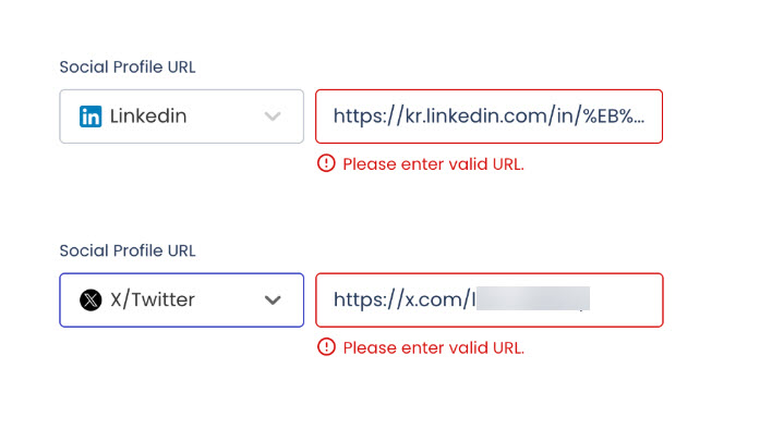 또는 소셜 프로파일 URL 등 추가적인 정보를 입력할 때 아래 그림과 같이 "Please enter valid URL" 오류가 발생하면서 가입이 진행되지 않는 경우도 있습니다. (드물지만) 전화번호도 입력이 안 된다고 호소하는 분도 계십니다.😥