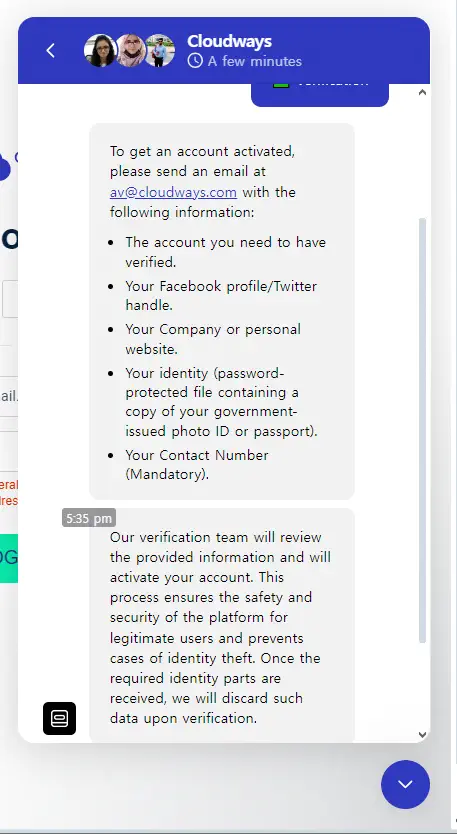 이런 경우에는 클라우드웨이즈에서 악의적인 사용자로 분류하여 가입을 불허하는 것 같습니다. 또한, 이메일을 통해 운영 중인 홈페이지 URL과 SNS 프로파일 URl을 요구하는 것으로 보아서 클라우드웨이즈는 실제로 사이트를 운영하려는 사용자인지를 알고 싶어 하는 것으로 보입니다.
