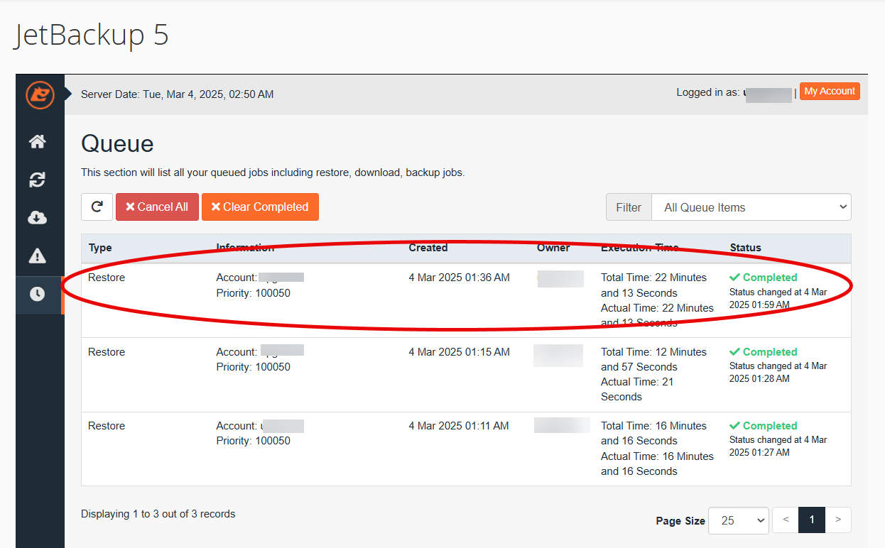 테스트를 해보니 전체 계정을 복원하는 것이 안정적으로 복원된다는 것을 느꼈습니다. 다운로드/복원을 요청한 경우 대기열(Queue)에서 진행 상황을 확인할 수 있습니다.