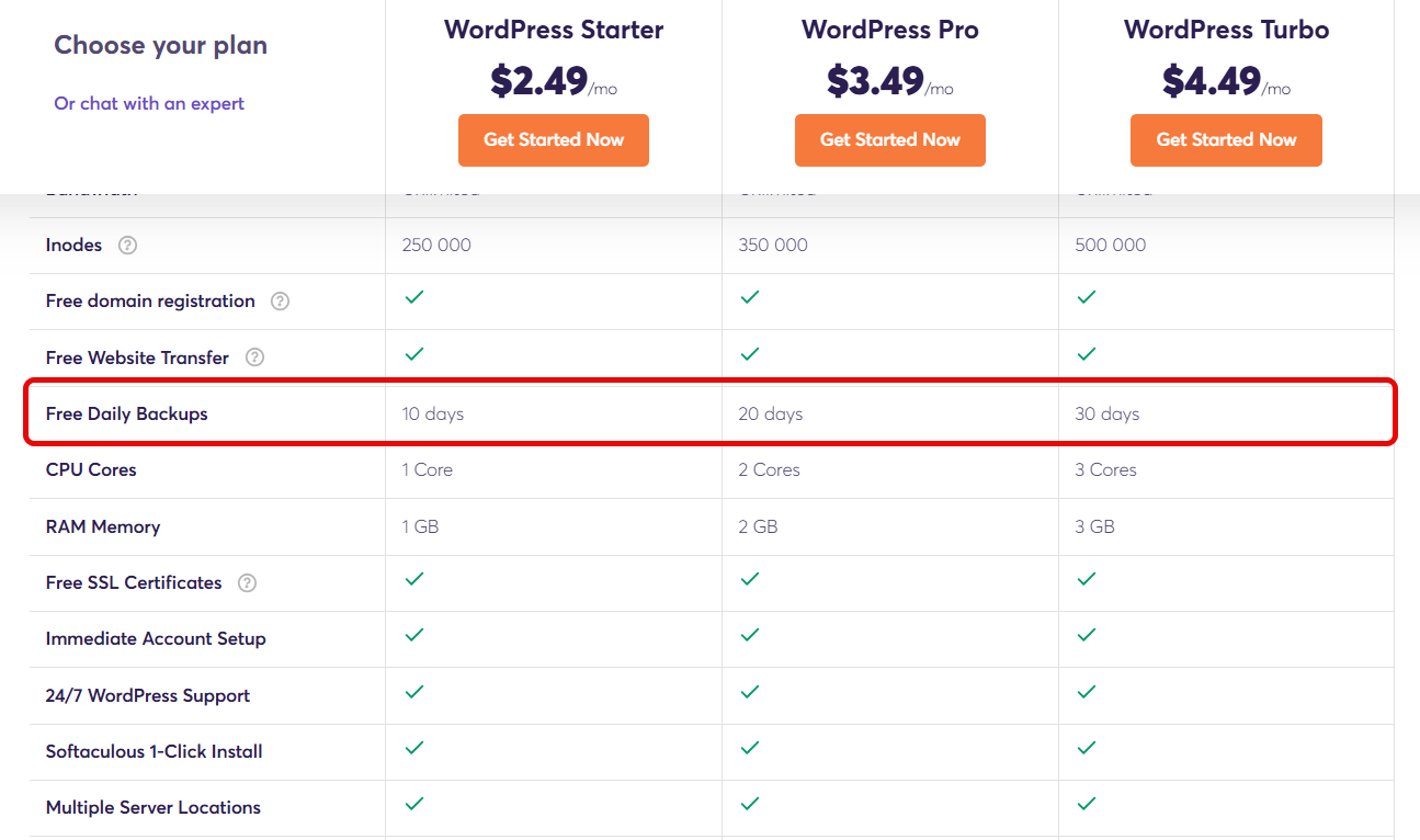 케미클라우드 워드프레스 호스팅은 플랜에 따라 10일 (WordPress Starter 플랜), 20일 (WordPress Pro 플랜), 30일 (WordPress Turbo 플랜) 간 무료 백업 & 복원 기능이 제공됩니다.
