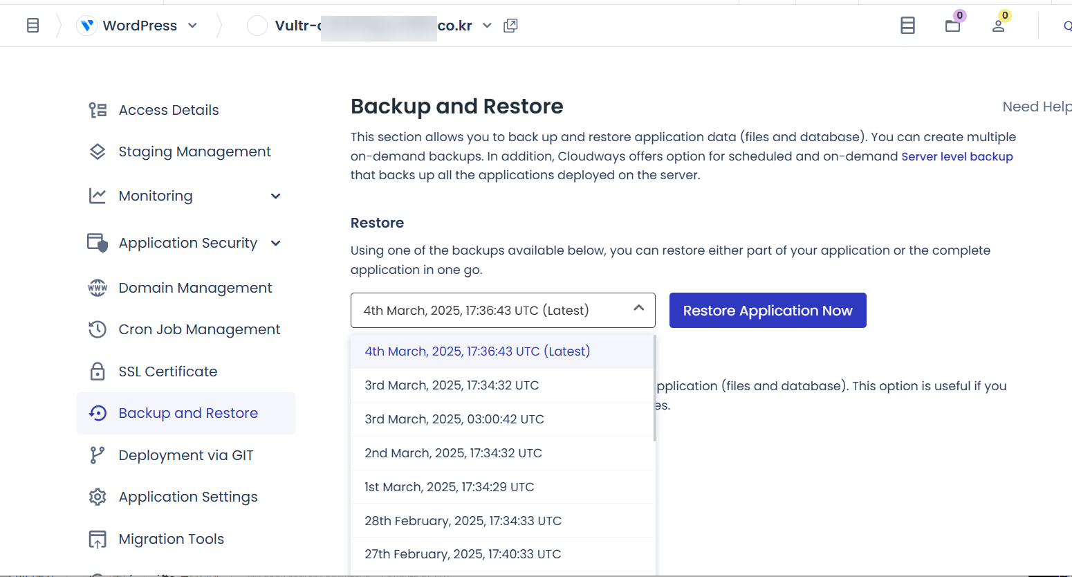 참고로 클라우드웨이즈에서도 백업/복원 기능이 제공되면 복원은 애플레케이션(개별 워드프레스 사이트)별로 가능합니다. 살펴보니 2주 이내의 기간으로 복원이 가능하네요.