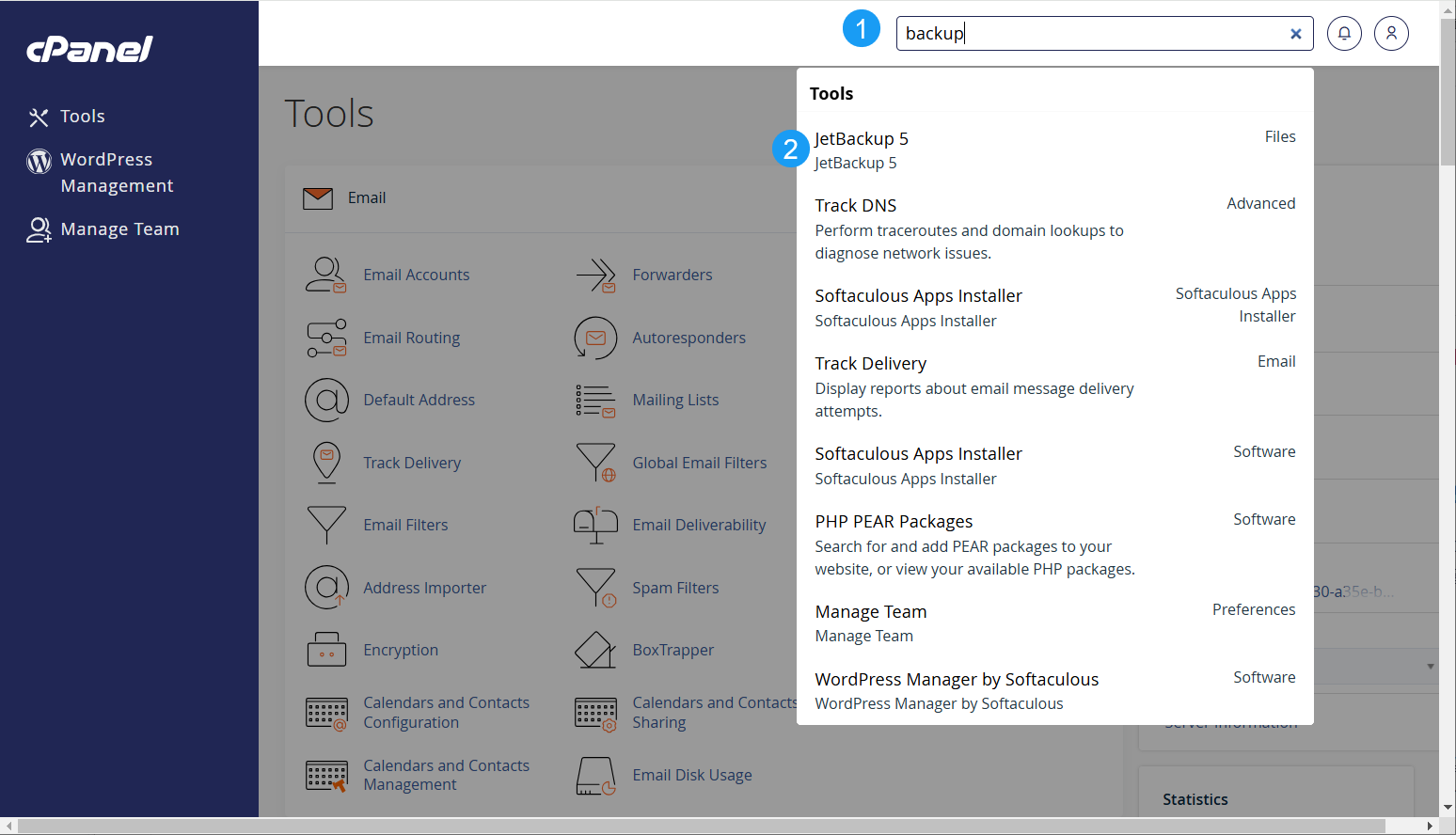 cPanel에 로그인하면 backup을 검색하여 JetBackup 5 툴을 선택합니다.