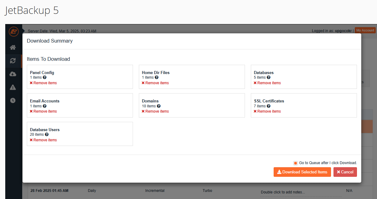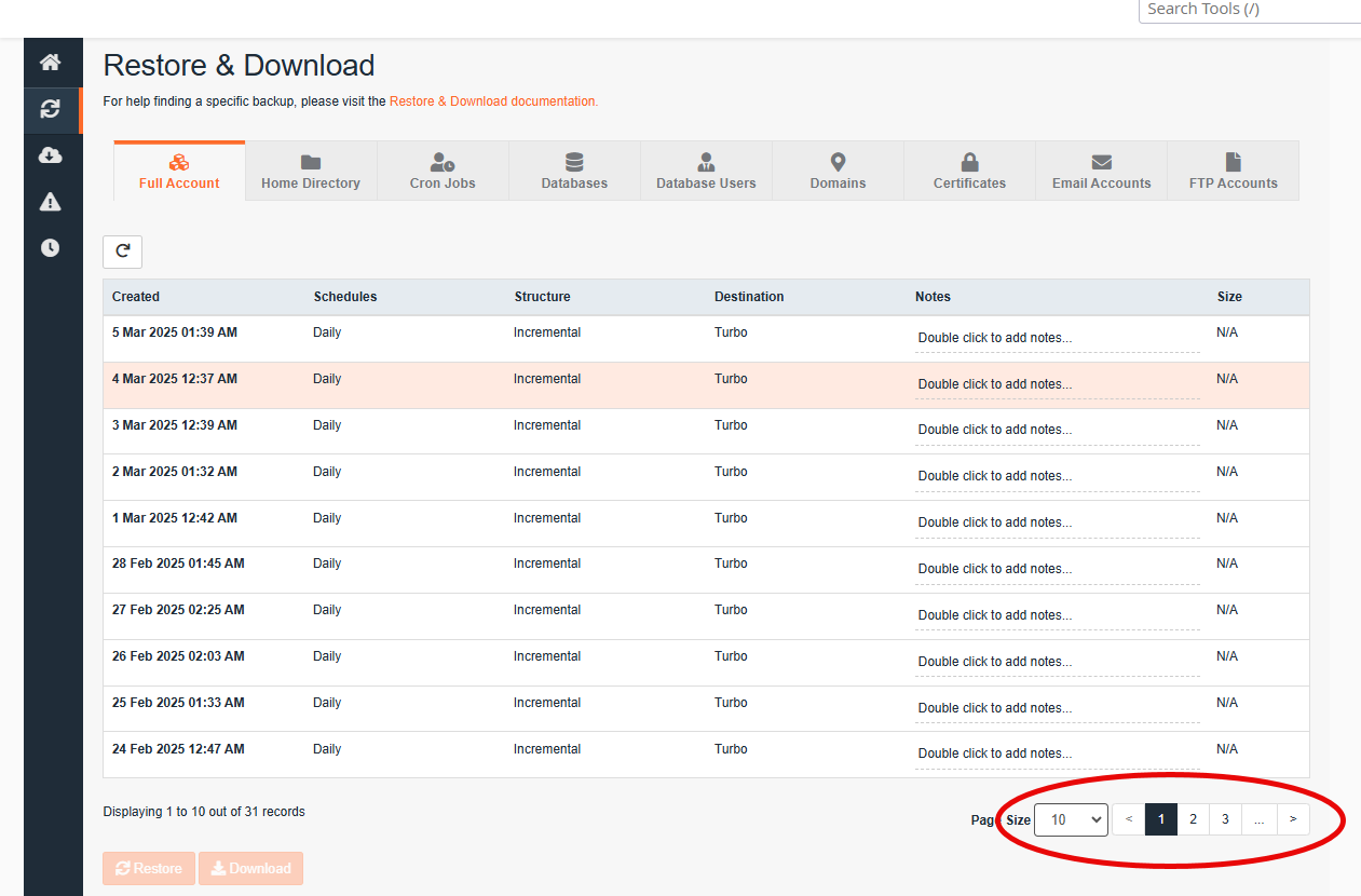 전체 계정을 백업하려면 해당 날짜의 백업을 선택하고 Download를 클릭합니다.