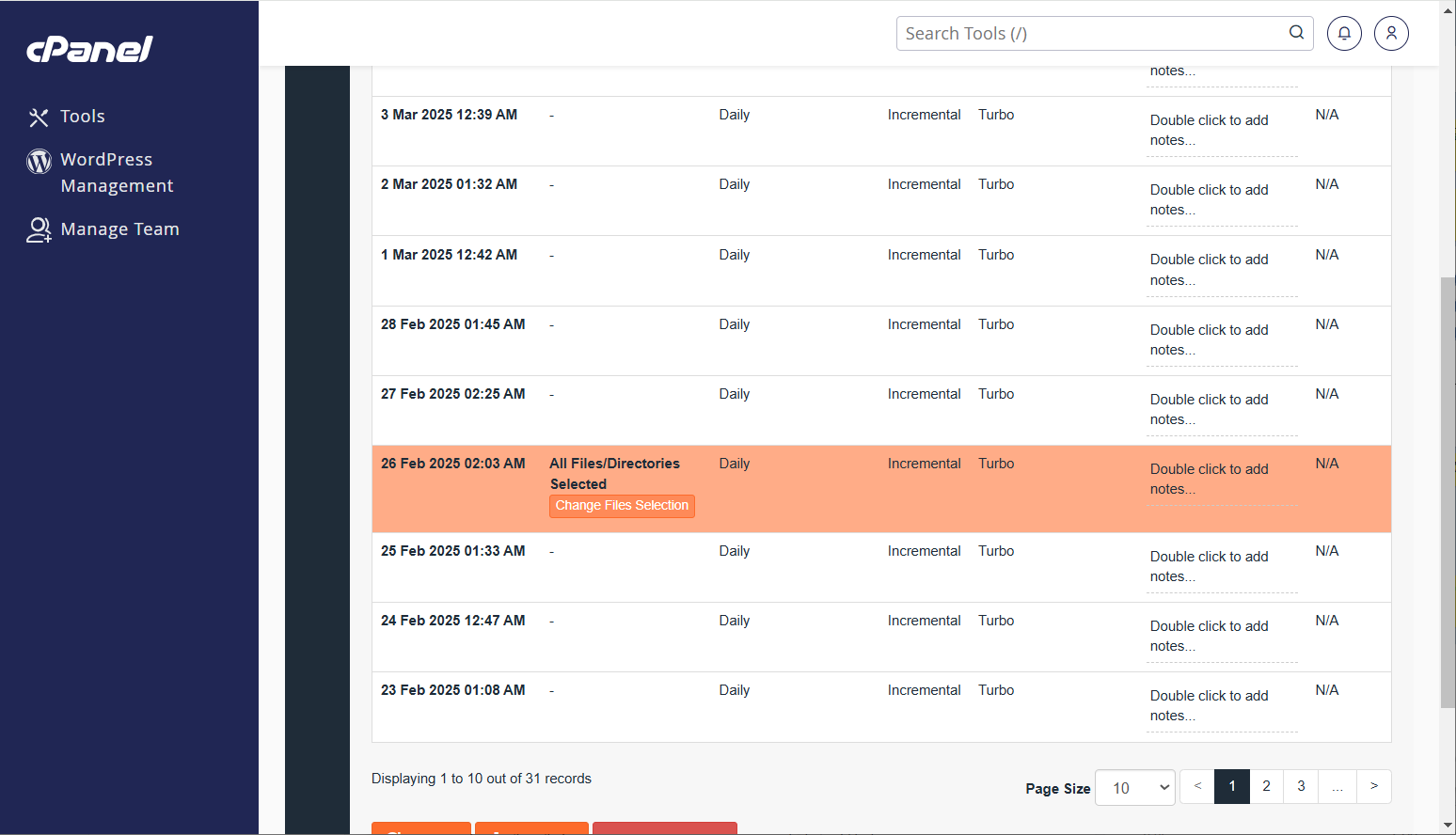 이용하는 호스팅 상품에 따라 백업의 개수가 다릅니다. WordPress Turbo 플랜의 경우 30일 간 백업본이 제공됩니다. 실제로 31개 항목이 표시되네요.