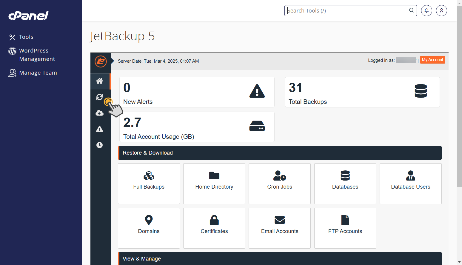 JetBackup 5 도구 페이지에 접속하면 Restore & Download 아이콘을 클릭합니다.
