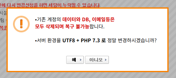 PHP 버전을 선택하고 변경 신청을 누르면 아래와 같이 데이터와 DB 백업에 대한 경고가 표시됩니다.