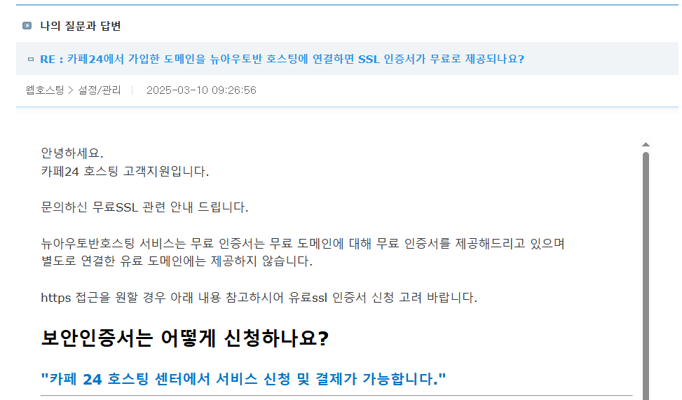 하지만 카페24의 뉴아우토반 상품은 기본적으로 제공되는 무료 도메인(예: example.mycafe24.com)에 대하여 무료로 SSL 인증서가 제공되고 도메인 등록업체에서 도메인을 구입하여 추가하는 경우 유료 SSL 인증서를 구입해야 합니다.