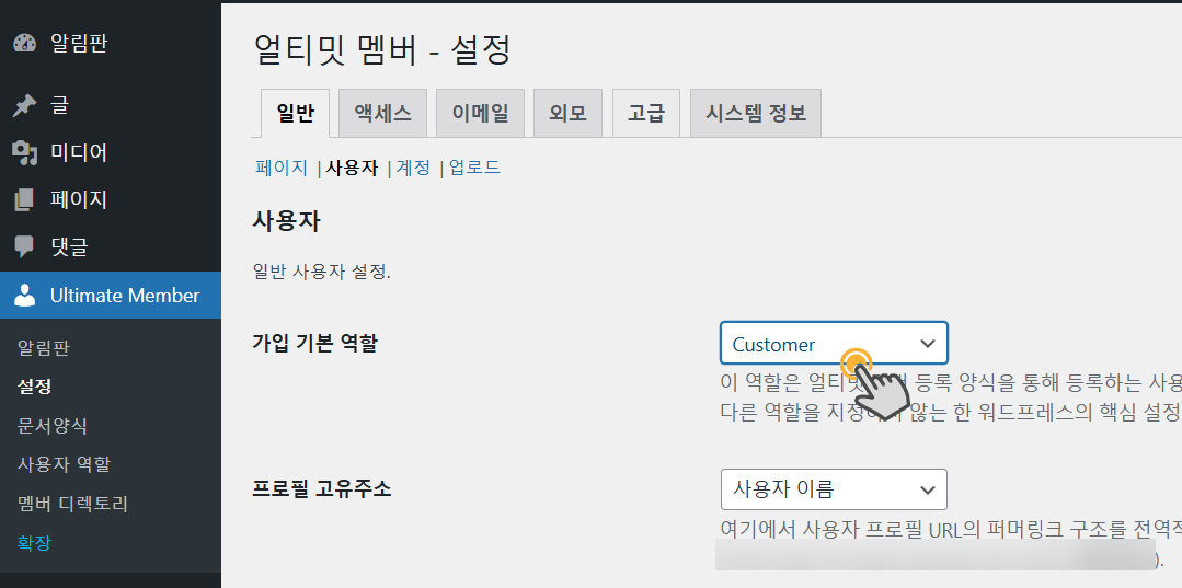 워드프레스 관리자 페이지 » Ultimate Member » 설정 » 일반 탭 » 사용자에서 가입 기본 역할을 지정하도록 합니다.