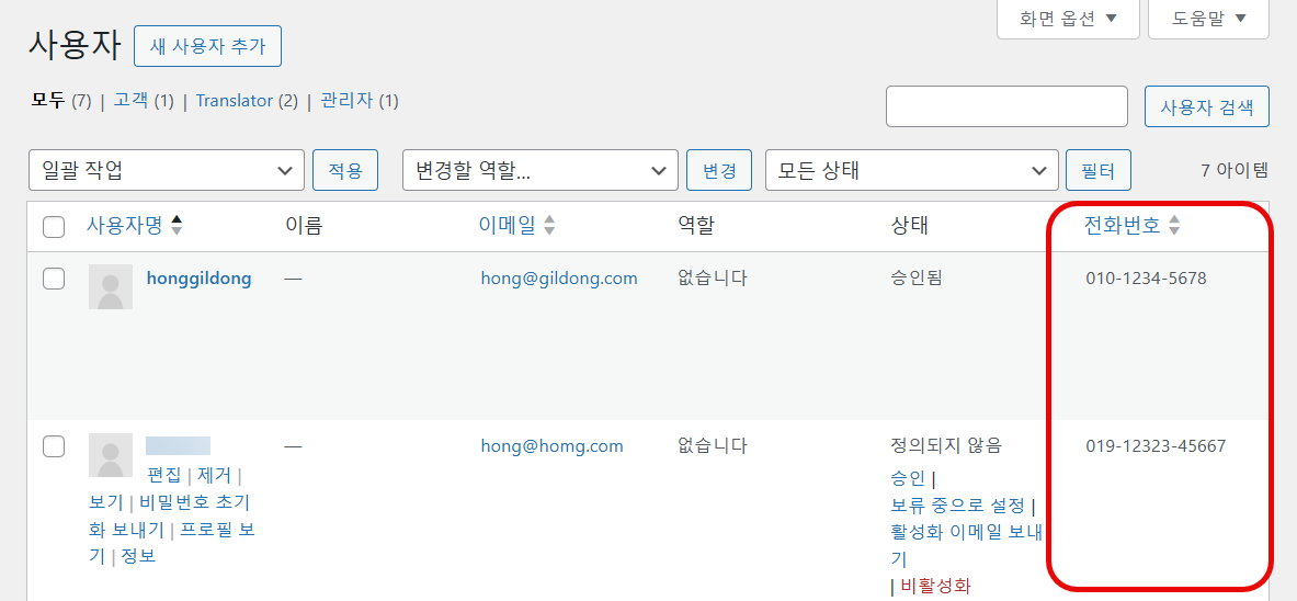 사용자 목록에 추가적인 정보(예: 전화번호)를 표시하고 싶은 경우에는 차일드 테마의 함수 파일에 커스텀 코드를 추가하여 표시하도록 할 수 있습니다.