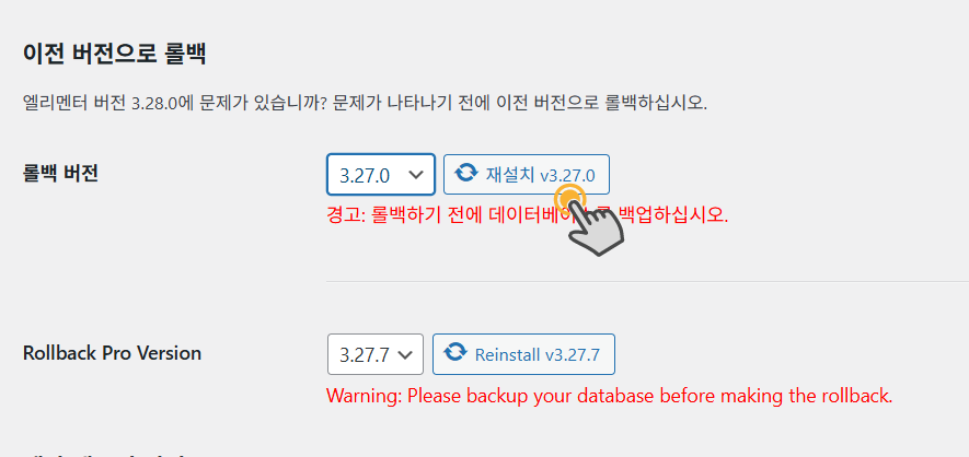 예를 들어, 롤백 버전에서 3.27.0을 선택하고 재설치 버튼을 클릭하면 엘리멘터 버전이 해당 버전으로 롤백됩니다.