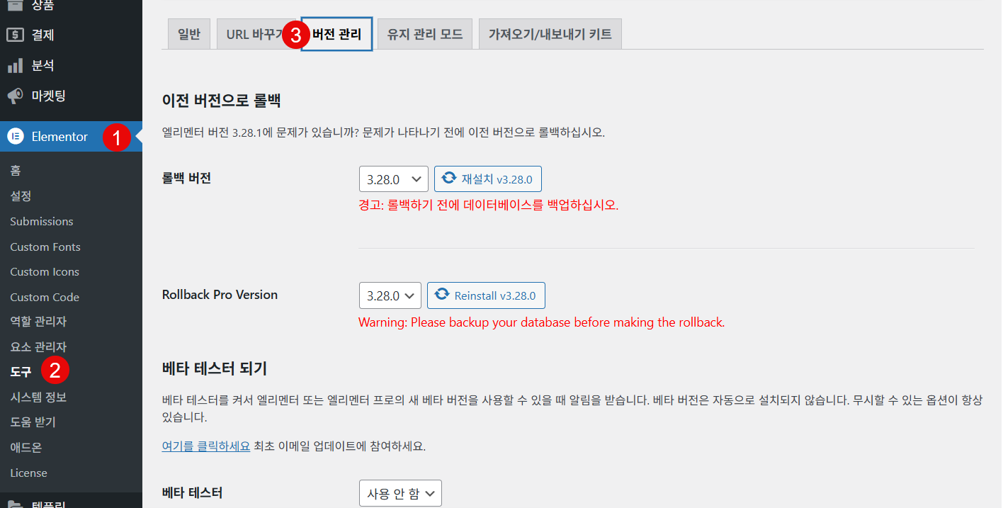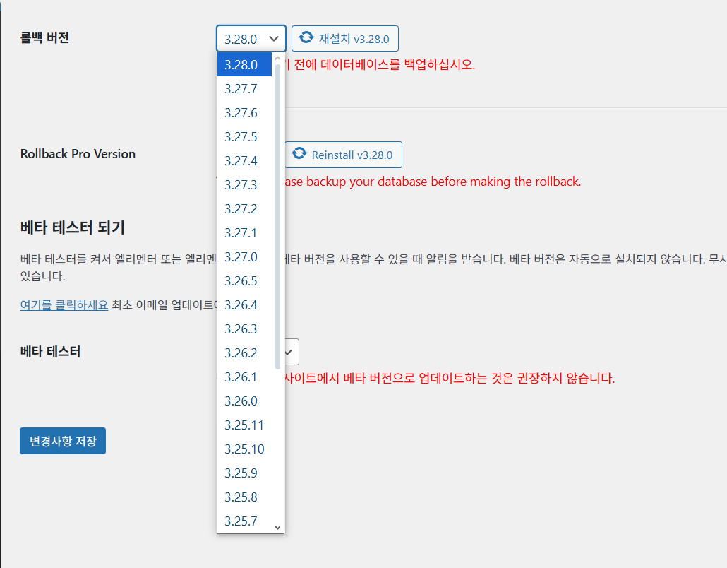엘리멘터 플러그인: 버전 변경, 롤백 방법