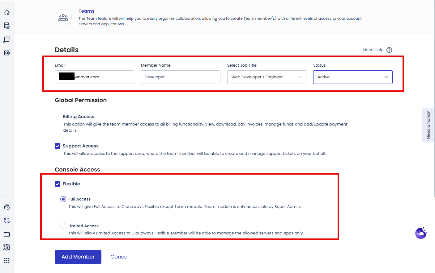 외부 개발자나 동료 직원이 클라우드웨이즈(Cloudways)에 접속하여 작업해야 하는 경우 팀 멤버로 추가하여 권한을 부여할 수 있습니다. 팀원 추가 시 모든 권한을 부여하거나 제한된 권한에만 액세스가 가능하도록 설정할 수 있습니다.