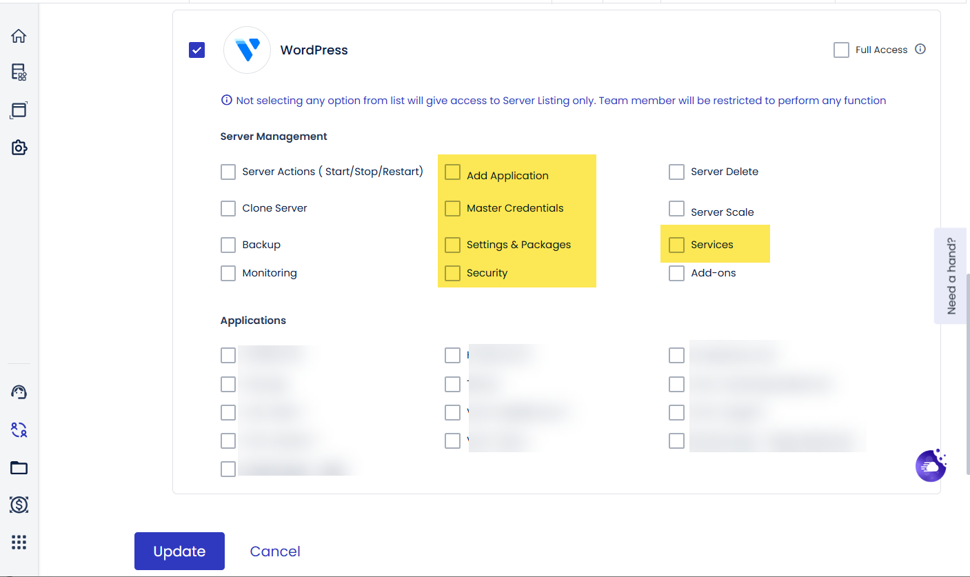 만약 서버에 대해서도 제한된 권한만을 부여하고 싶은 경우에는 Full Access 체크를 해제합니다. 예를 들어, Server Management에서 하이라이트된 항목들을 체크할 수 있을 것입니다.