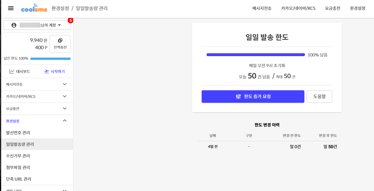 기본적으로 일일 발송량은 50건으로 설정되어 있으며, 많은 문자가 발송되는 환경에서는 이 한도를 증가할 수 있습니다.
