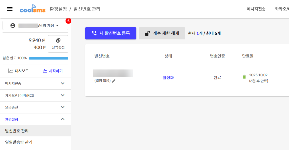 환경설정에서 발신번호를 등록할 수 있고, 일일발송량 설정도 가능합니다.