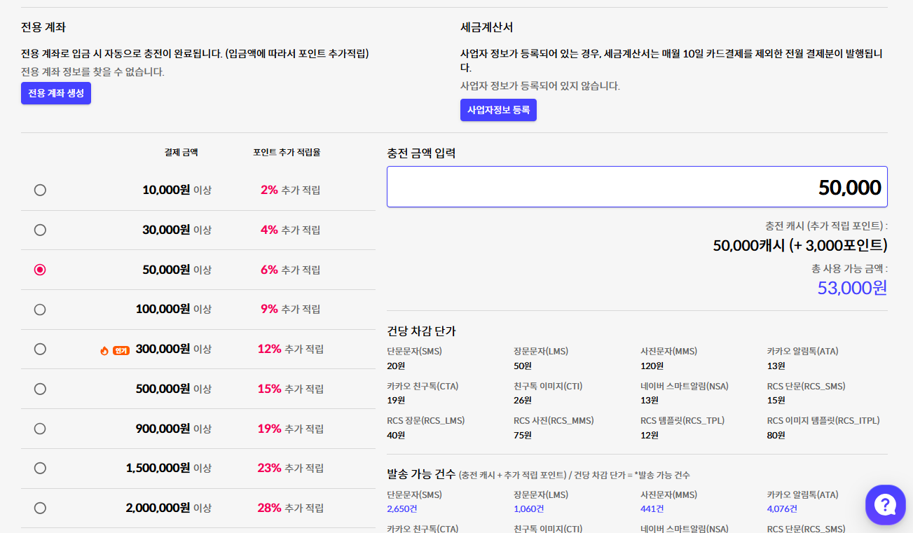 문자 발송 요금은 단문의 경우 건당 20원입니다. 요청을 충전하여 이용하는 방식인데, 충전 금액이 높을수록 더 많은 추가 적립을 받을 수 있습니다.
