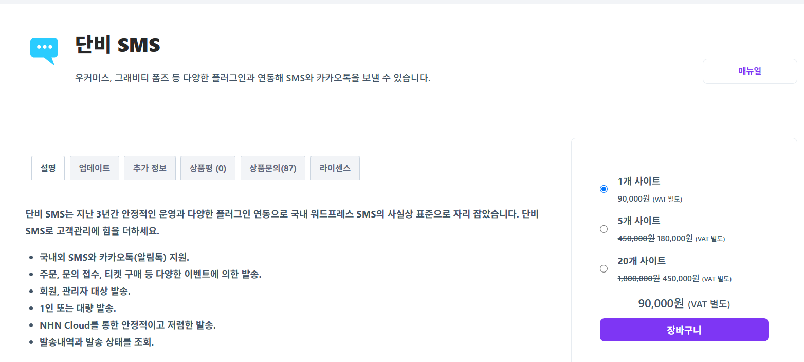 이 플러그인은 1개 사이트의 경우 연간 9만원(VAT 별도)에 이용이 가능하며 몇 가지 플러그인과의 연동 기능을 제공하므로 쉽게 문자 발송 기능을 워드프레스에 추가하려는 경우 고려할 수 있을 것 같습니다.