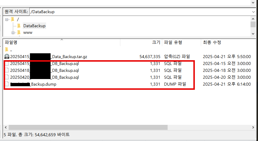 백업된 DB 크기가 모두 1,331바이트로 아무 내용이 없는 디비였습니다.