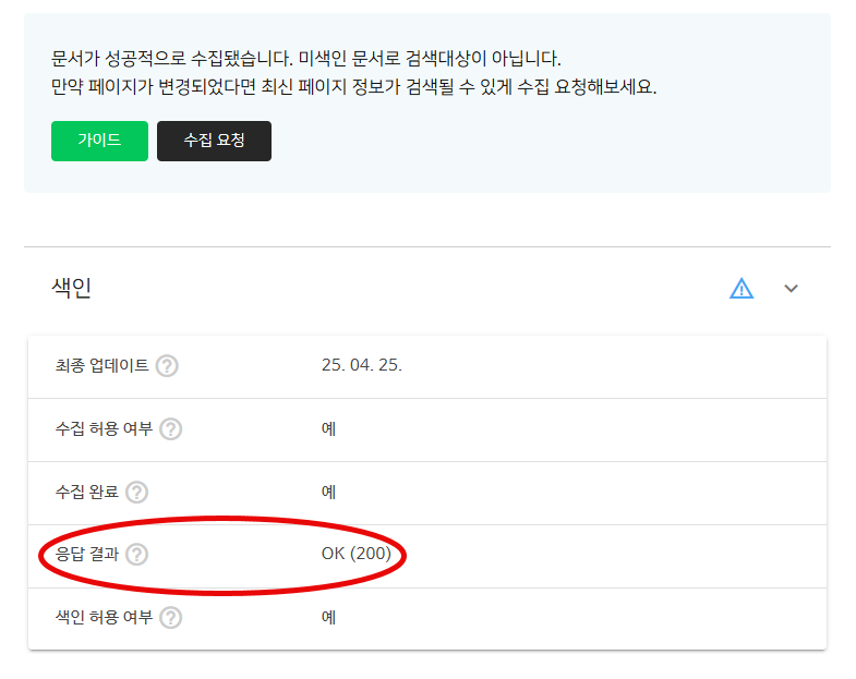 네이버 웹마스터 도구에서 URL 검사 시 아래 그림과 같이 "OK (200)" 응답 결과가 표시되어야 합니다.
