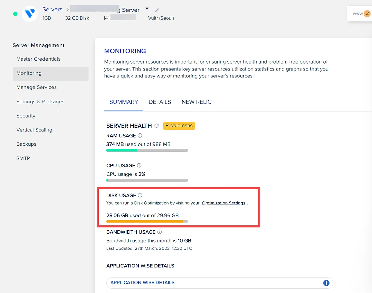 서버 디스크 용량이 부족한 경우에도 Monitoring 메뉴의 Server Health에 Problematic이 표시될 수 있습니다.