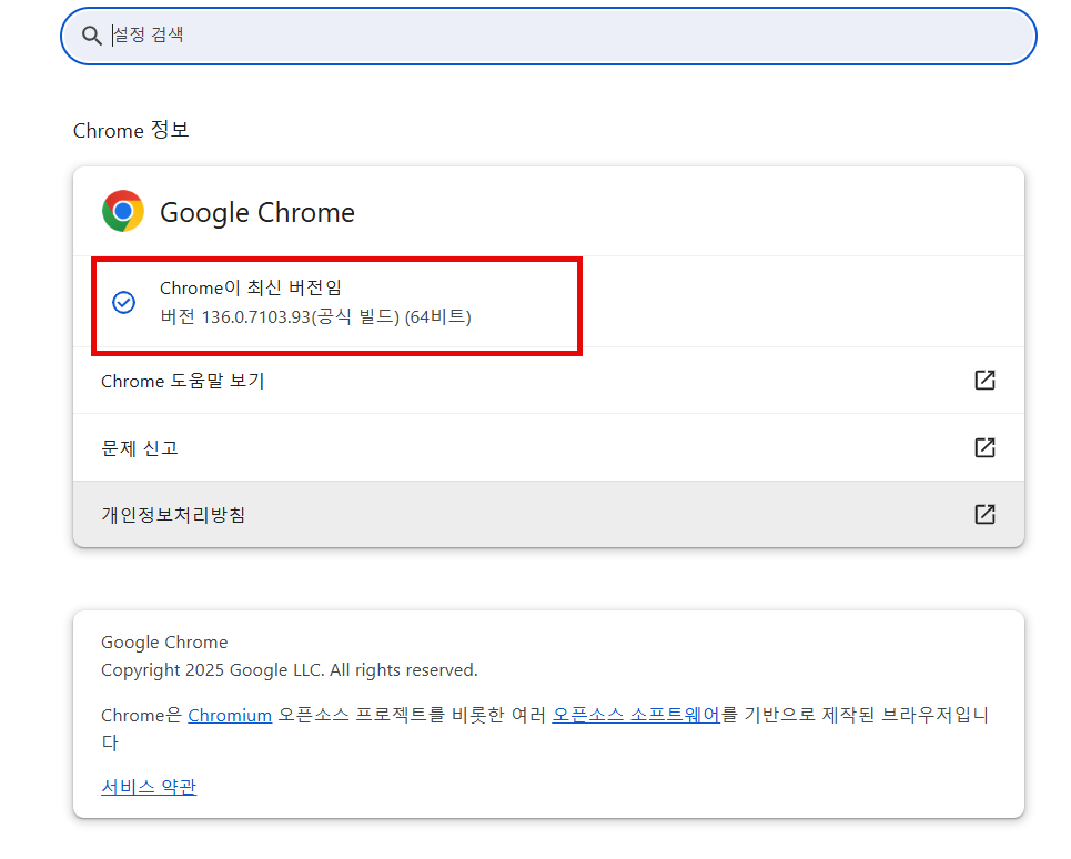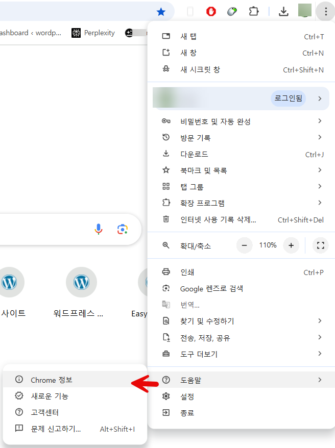 크롬이 최신 버전이 아니라면 도움말 » Chrome 정보를 클릭하면 크롬 브라우저가 최신 버전으로 업데이트됩니다. (크롬 브라우저의 주소창에서 chrome://settings/help을 입력하여 Chrome 정보 페이지에 접속하는 것도 가능합니다.)
