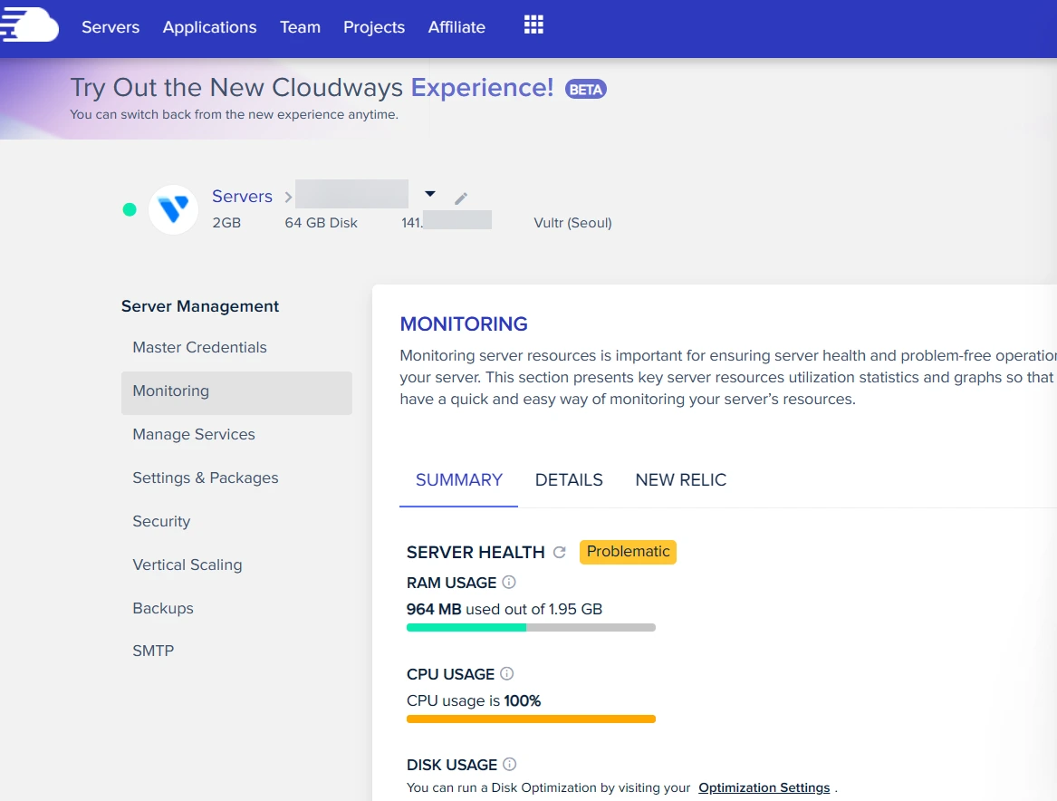 디도스 공격을 당하거나 서버 리소스 부족 등 문제가 있다면 램 사용량이나 CPU 사용량이 급증하면서 Problematic 경고가 표시될 수 있습니다.