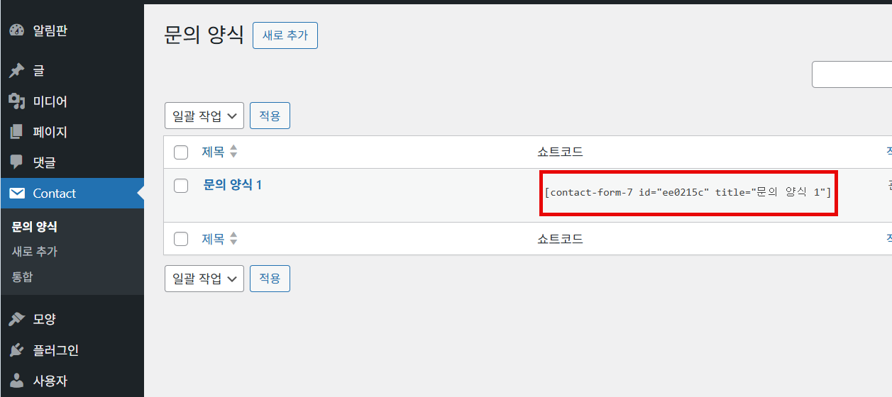Contact Form 7의 경우 Contact » 문의 양식에서 해당 문의 양식의 쇼트코드를 확인할 수 있습니다.