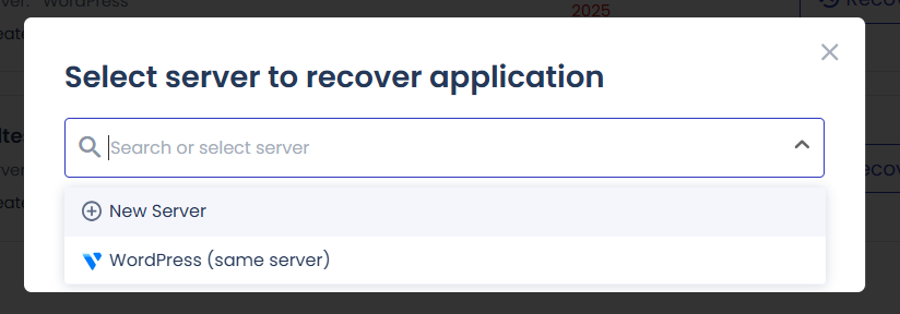애플리케이션이 복원될 서버를 선택하는 팝업이 표시됩니다. 만약 서버가 하나도 없거나 다른 서버에 복원하기를 원하는 경우에는 New Server를 선택하여 새로운 서버를 생성합니다.