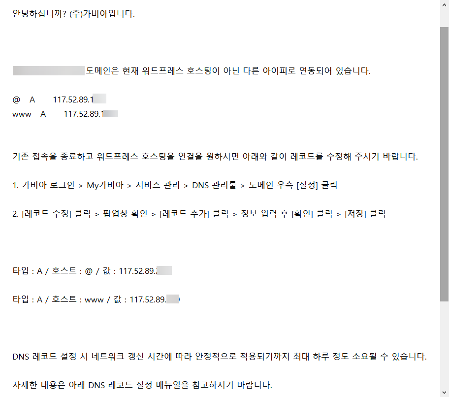 문제의 원인을 찾지 못하는 경우 가비아 고객센터에 문의해볼 수 있습니다. 저는 가비아에 이 문제를 문의하니 도메인의 IP 주소가 잘못 설정된 것이 원인이라는 답장을 받았습니다.
