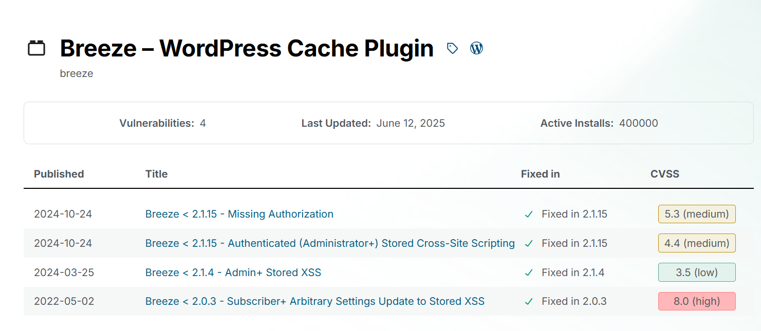 Breeze는 Cloudways에서 개발되어 유지되고 있는 무료 워드프레스 캐시 플러그인입니다. 이 플러그인은 지속적으로 업데이트되고 있으므로 클라우드웨이즈에서 이 캐시 플러그인을 사용하고 있다면 자동 업데이트 기능을 활성화하여 항상 최신 버전으로 업데이트하는 것이 좋습니다. 업데이트에는 보안 취약취약점에 대한 패치도 포함될 수 있습니다.