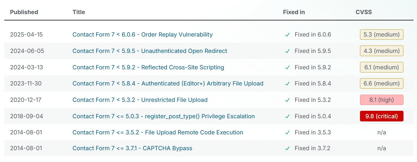 워드프레스 플러그인에서 보안 취약점이 발견되면 문제가 수정된 업데이트가 이루어지므로 가급적 최신 버전으로 업데이트하여 유지하는 것이 안전합니다. 예를 들어, 인기 문의폼 플러그인인 Contact Form 7은 보안 취약점이 자주 발견되므로 이 플러그인을 사용한다면 반드시 최신 버전으로 유지할 것을 권장합니다.