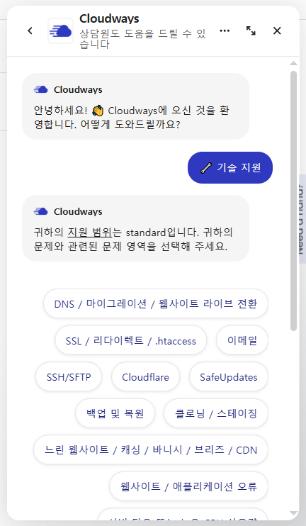 클라우드웨이즈를 이용하다 문제가 발생하거나 궁금한 점이 있으면 언제라도 라이브 채팅으로 상담원에게 문의할 수 있습니다. 먼저는 해당 질문에 대하여 AI가 답변을 해줍니다. 클라우드웨이즈 이용과 관련되는 경우 AI의 답변이 상당히 유용할 수 있습니다.