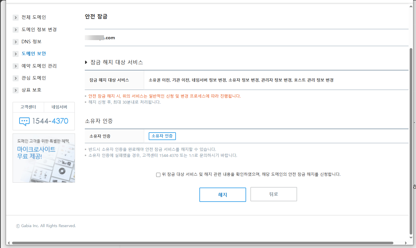 먼저 가비아에 로그인하여 안전 잠금과 등록정보 숨김 서비스를 해지해야 합니다.