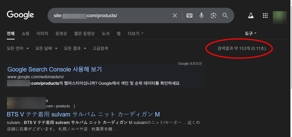 products 디렉터리로 시작하는 URL 개수가 153개 정도네요.