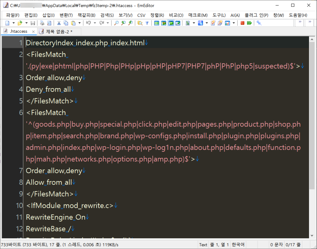 - wp-config.php 파일이나 .htaccess 파일에 이상한 코드가 생성되어 있는 경우