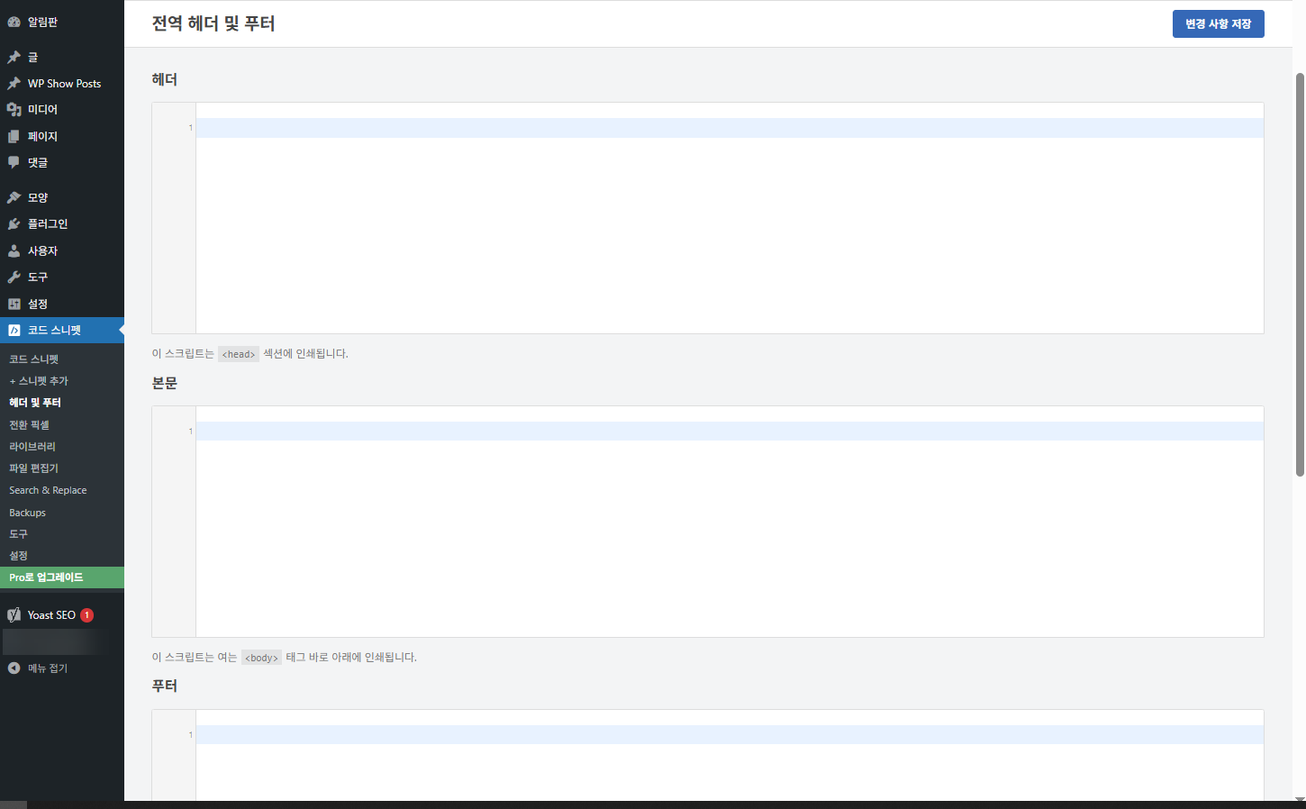 이 플러그인을 사용하여 헤더나 푸터에 코드를 추가하면 사이트 전체에서 해당 코드가 헤더나 푸터에 삽입됩니다.