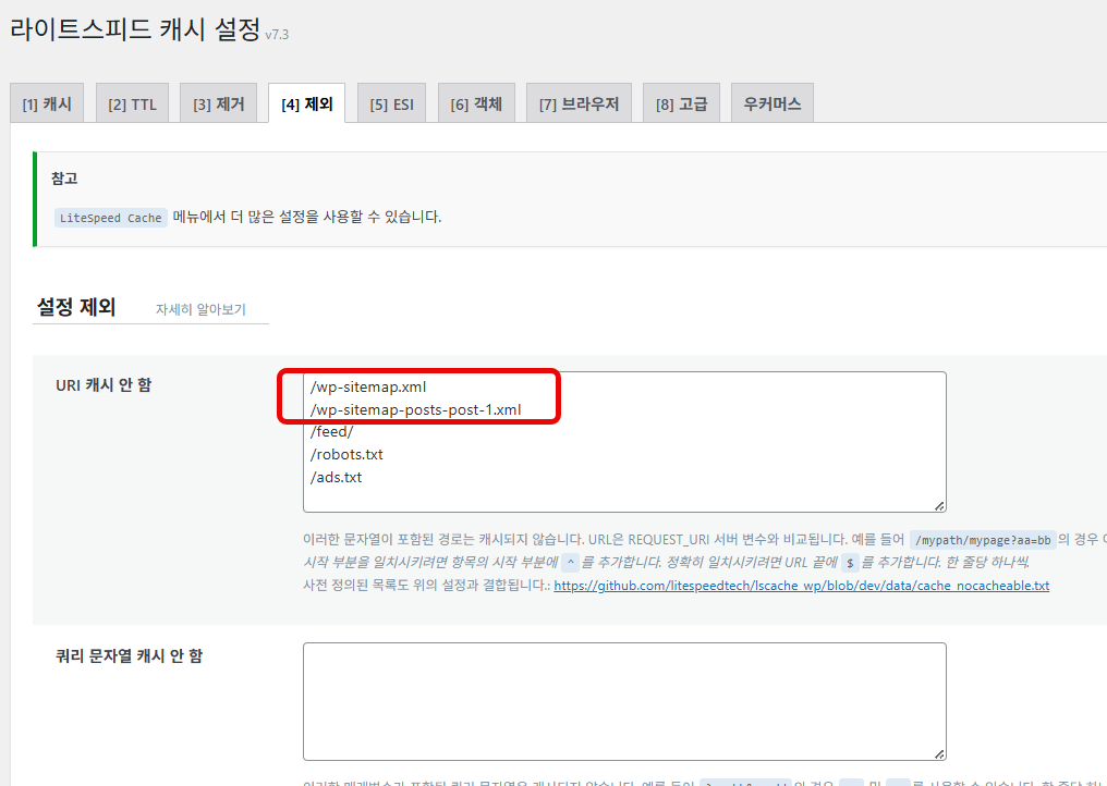 WP Rocket 플러그인을 사용하는 경우에도 비슷한 방식으로 접근하여 사이트맵, robots.txt, feed, ads.txt 등에 대하여 캐시 제외 설정을 할 수 있습니다.