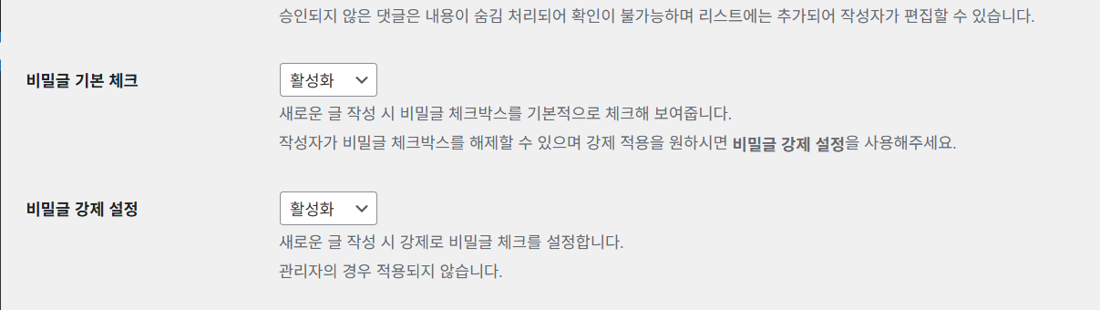 아래로 스크롤하여 비밀글 기본 체크 옵션과 비밀글 강제 설정 옵션을 활성화합니다.