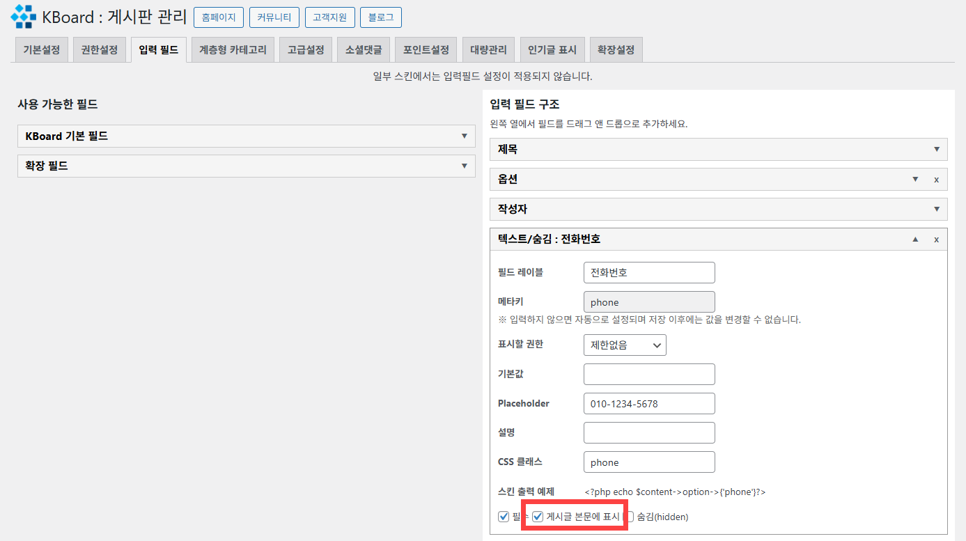 케이보드에서 게시글을 작성할 때 추가 입력 필드(예: 전화번호 등)를 추가하려는 경우 입력 필드 탭에서 확장 필드를 선택하여 추가할 수 있습니다.